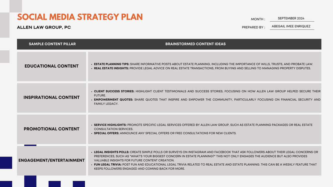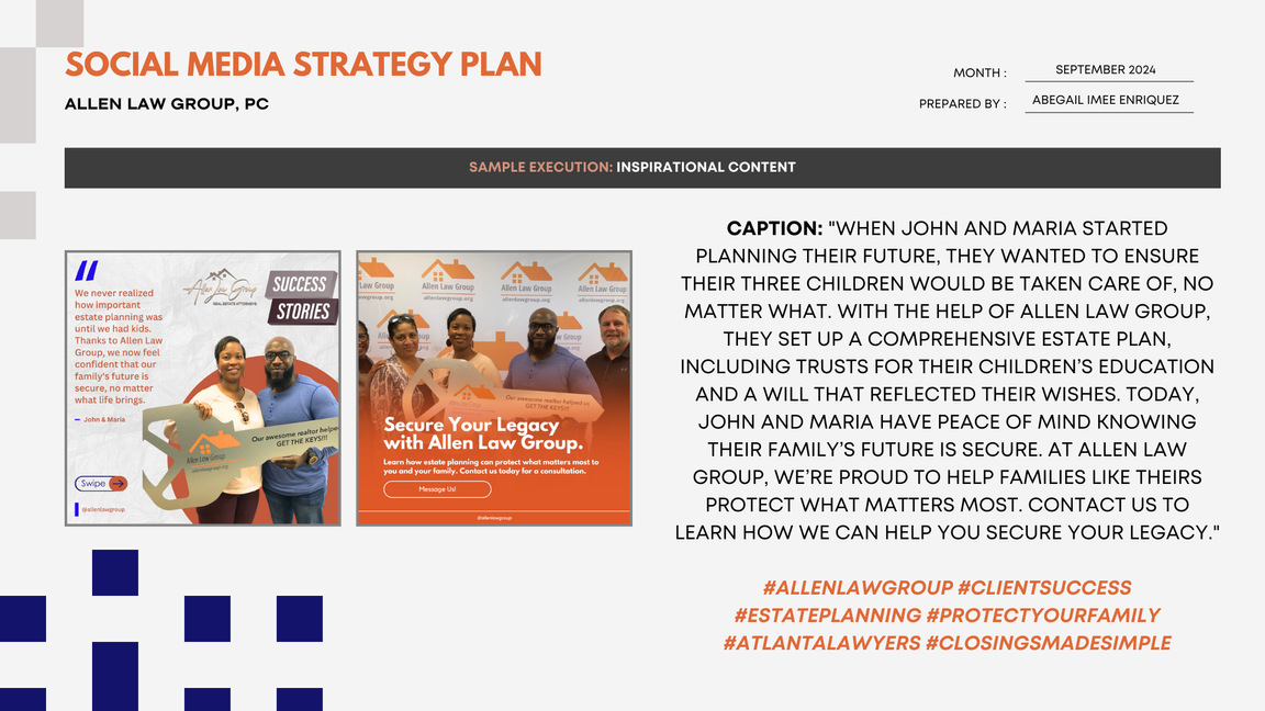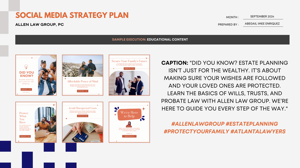 WHAT I DID: I developed a comprehensive social media strategy plan for Allen Law Group, focusing on educational, inspirational, promotional, and engagement content. This plan aimed to inform clients about estate planning and real estate law while increasing engagement through polls, client success stories, and legal trivia, effectively boosting the firm’s online presence and client interactions.
