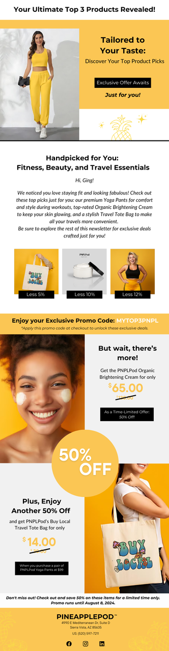 WHAT I DID: Reflecting every detail from the buyer persona, I designed a visually engaging email newsletter for Pineapple Pod, featuring personalized product recommendations and exclusive promotions. The layout effectively captures the brand’s vibrant style, helping to drive customer engagement and boost sales through targeted offers and visually appealing content.